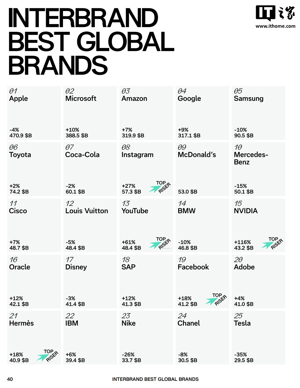 该媒体支持尽管该排名带有一定主观性,但 Interbrand 的年度报告长期以来为观察品牌认知与市场价值的演变提供了重要参考。今年的榜单显示,尽管苹果以 4709 亿美元的品牌价值位居第一,但其价值相较去年实际下滑了 4%。