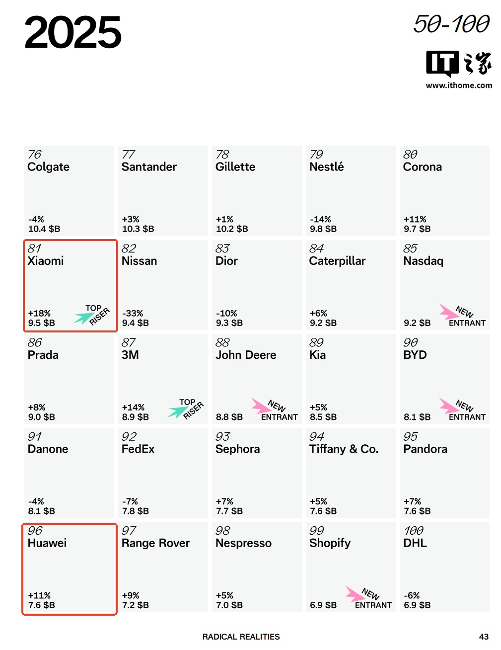 IT之家查询报告内容,小米(Xiaomi)品牌预估价值为 95 亿美元,同比增长 18%,位列第 81 位;华为品牌价值为 76 亿美元,同比增长 11%,位列第 96 位。